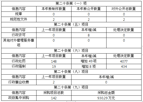 按照全省统一分类,主动公开本机关的政府信息。据统计,2019年,我局主动公开政府信息共1028条,其中,政务动态725条,公告公示103条,人事信息4条,财经信息7条,行政执法信息46条。无其他需要公开的信息。公开的政府信息未涉及国家秘密、商业秘密和个人隐私。
