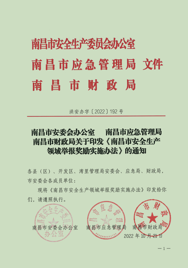 南昌市安委会办公室 南昌市应急管理局 南昌市财政局关于印发《南昌市安全生产领域举报奖励实施办法》的通知