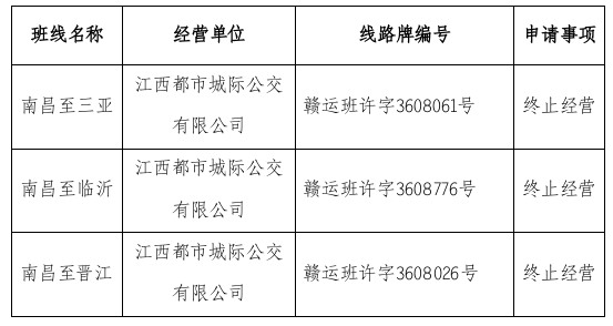 近日,江西都市城际公交有限公司申请终止南昌至三亚、南昌至临沂、南昌至晋江道路客运班线经营,根据《中华人民共和国道路运输条例》、《道路旅客运输及客运站管理规定》(中华人民共和国交通运输部令2022年第33号)等有关规定,现予以公示,公示时间:2023年5月17日至2023年5月27日。