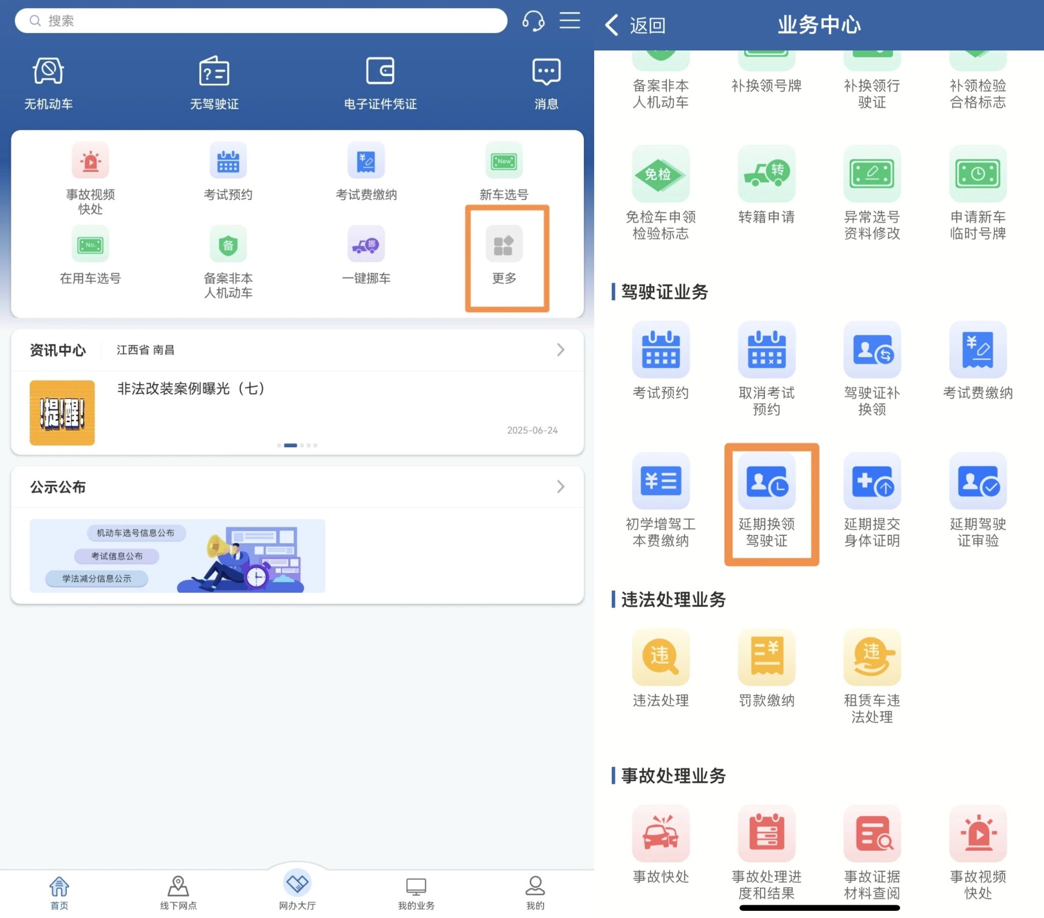 打开“交管12123”手机APP,点击“更多”,选择“延期换领驾驶证”。