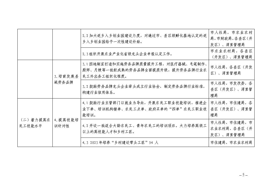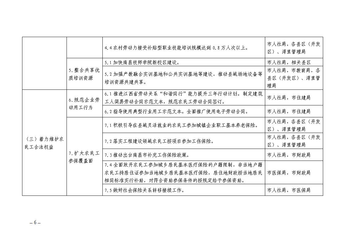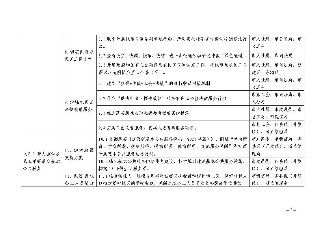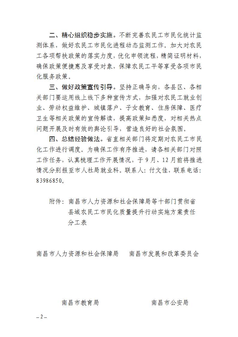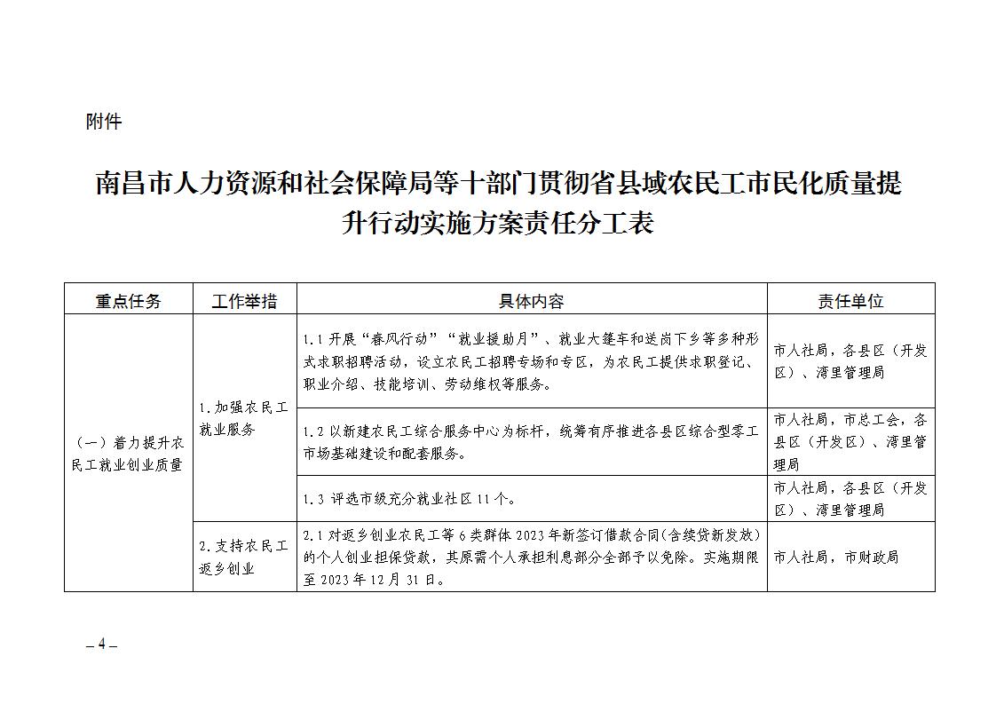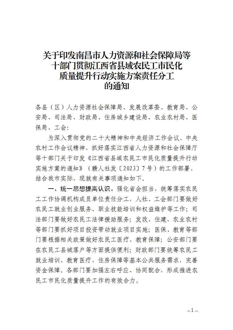 关于印发南昌市人力资源和社会保障局等十部门贯彻江西省县域农民工市民化质量提升行动实施方案责任分工的通知